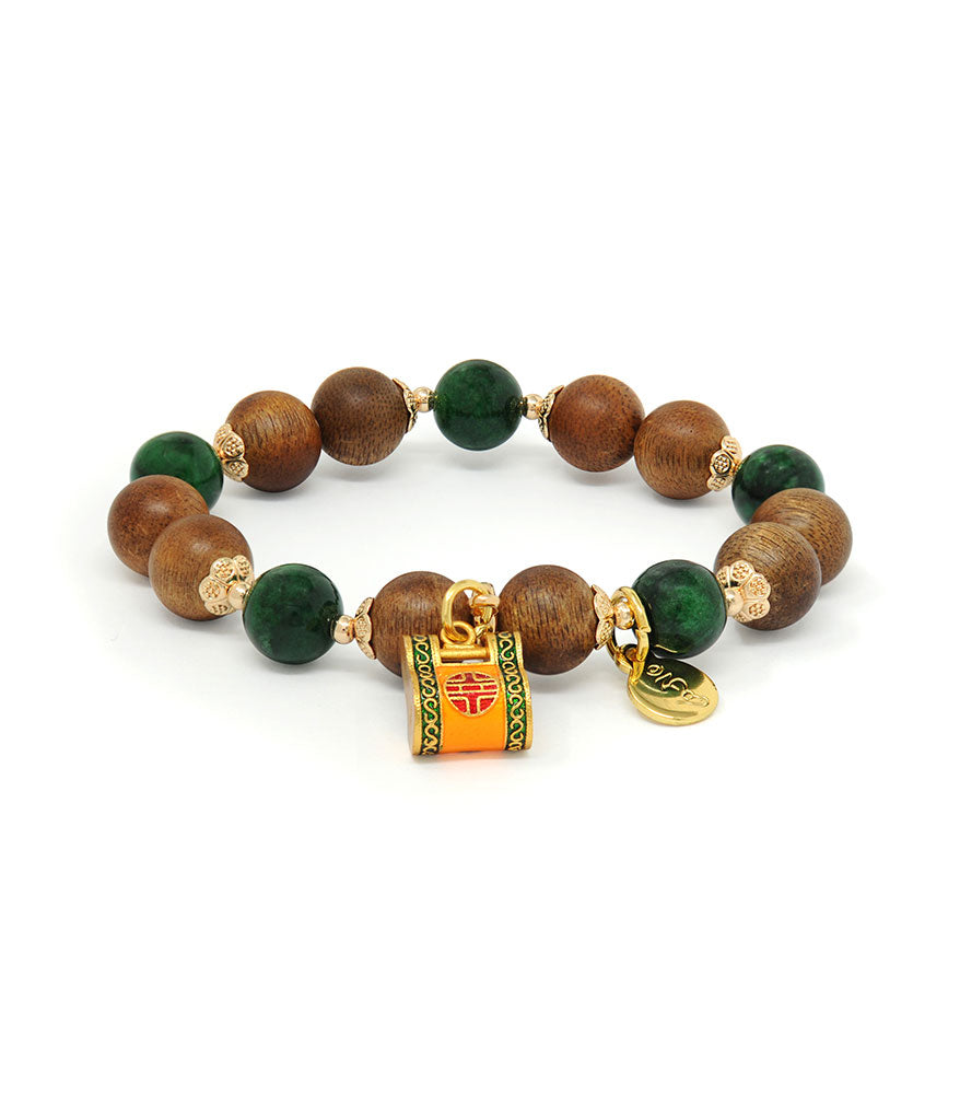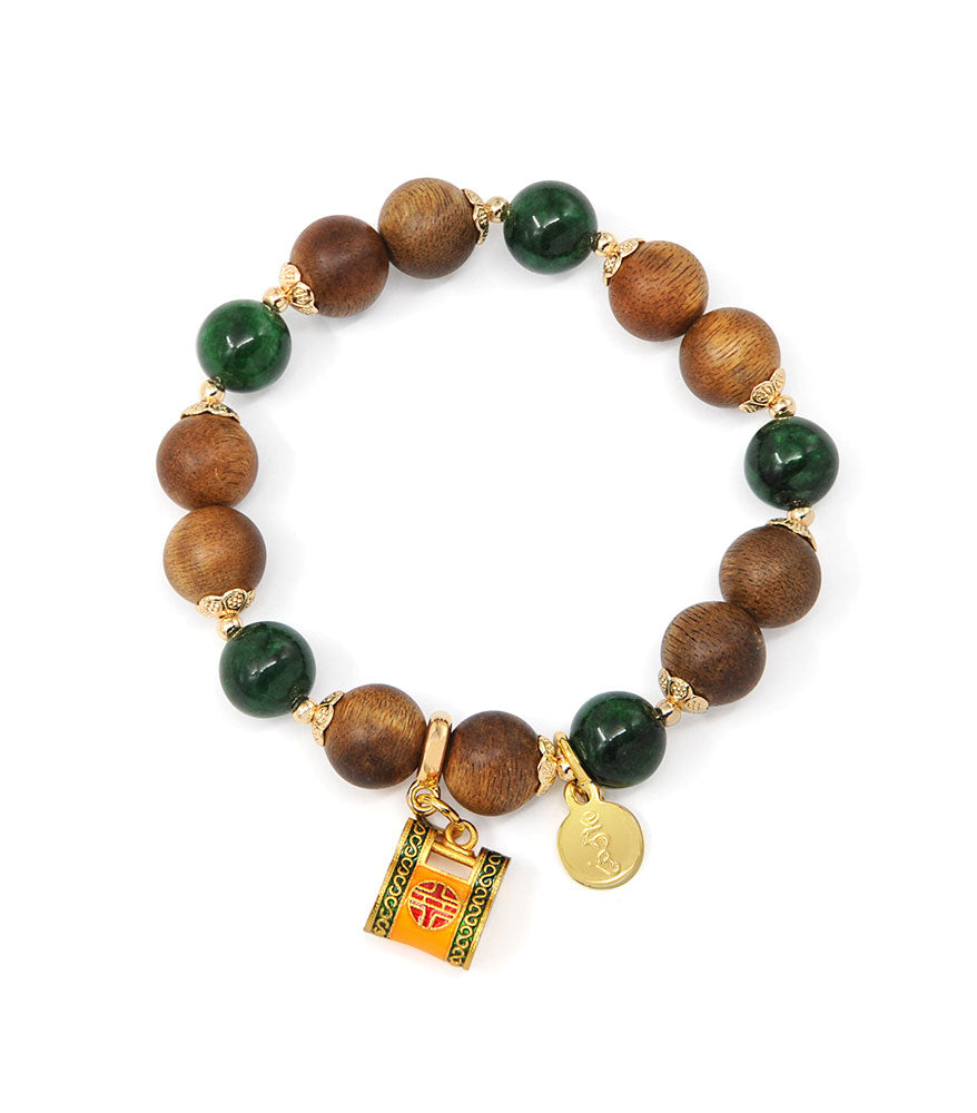 This bracelet is strung with Agarwood and Jadeite beads, with Wealth Lock and “Om Mani