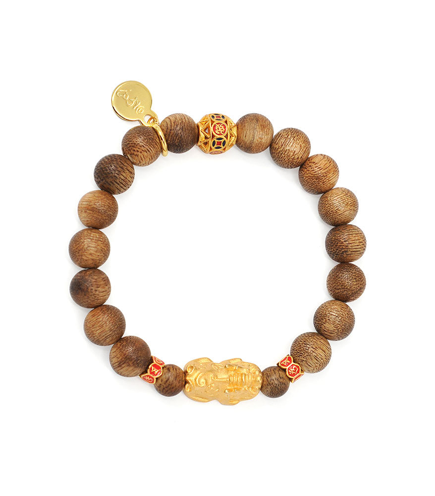 This bracelet features Agarwood beads, a stunning sand gold Pi Yao, cloisonné I-Ching Coin, and gold Om Mani Padme Hum charm. Agarwood enhances energy levels and wards off negativity. The Pi Yao and I-Ching Coin are powerful symbols of wealth. The Om Mani Padme Hum charm offers divine blessings and spiritual protection.