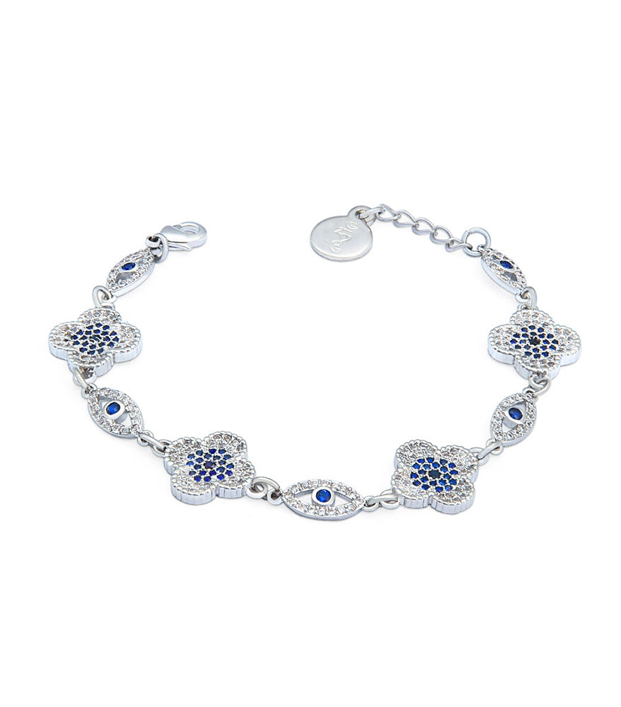 This exquisite bracelet features the Anti-Evil Eye amulet, famous across the Mediterranean for its powers of protection against the Evil Eye, the eye of jealousy. Strung with four-leafed clovers, a universal symbol of good luck, this bracelet brings good luck and good news, while protecting you against the envy of others.