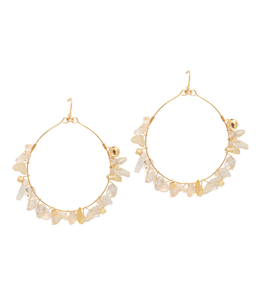 Attract wealth and abundance with these divine Citrine hoop earrings. Featuring a golden HUM bead on each side, these earrings will help you actualize your wishes. The HUM syllable is believed to be the foundation of all prayers and mantras. It removes obstacles and brings good fortune, and is also a powerful symbol of protection, creating a shield against premature death, harmful spirits and the negative emanations of inauspicious stars.