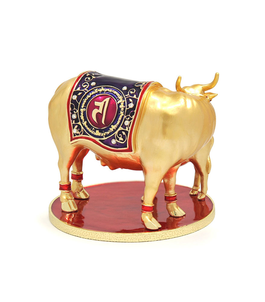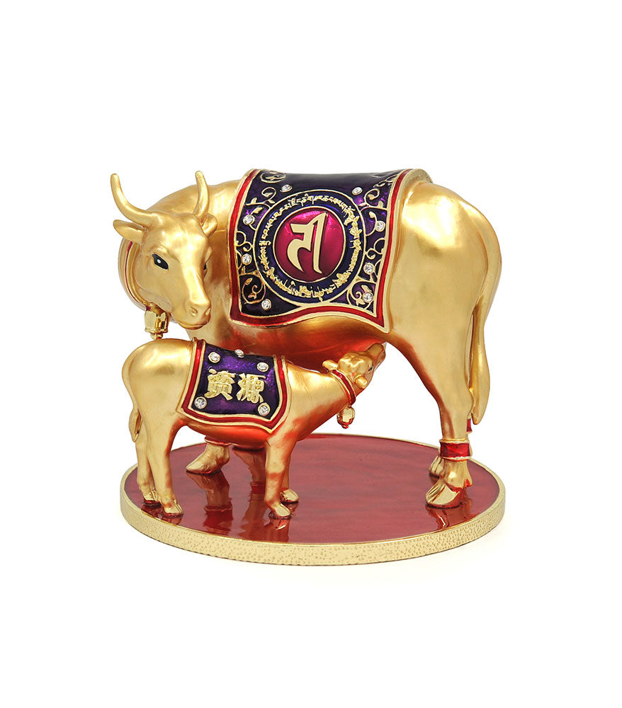 The cow is a symbol of motherhood and nurturing, while the calf represents youth, hope and promise for the future. Together they symbolize sustenance, resources and continuity, forming the building blocks for prosperity. The Cow has the Resource Amulet encircled by the Wish-granting Mantra; the Calf has the Chinese word for “Resource”.