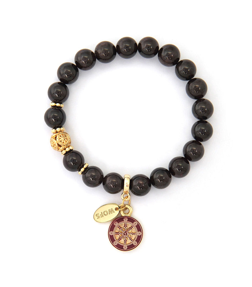 Care instructions: This charm bracelet contains: dharmachakra wheel charm, garnet crystal beads. To clean, use a damp cloth but do not soak in water. Silver elements may tarnish when exposed to sweat for prolonged periods; polish with a jewellery cleaning cloth to maintain a quality shine.
