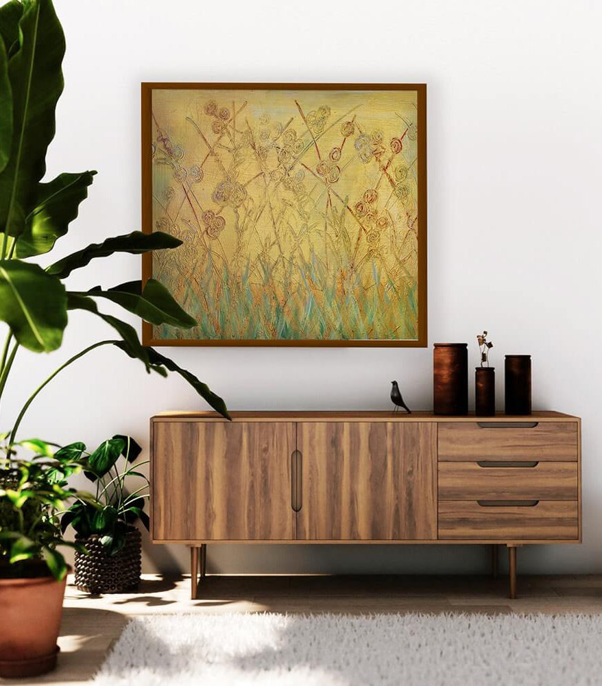 Golden light glowing on a field of flowers. This painting represents a lightness and a freedom. Well placed in the West for children and creativity, activating the metal element.