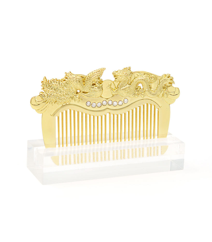 This Happy Marriage Comb features the celestial Dragon and Phoenix, which together symbolize the epitome of a harmonious and successful marriage, where neither dominates over the other. The symbolism represents a patriarchal and matriarchal couple, who if they have children also represents filial offspring who bring a good name to the family. With this comb in the home, it becomes impossible for troublesome third parties or outside influences to come between husband and wife.