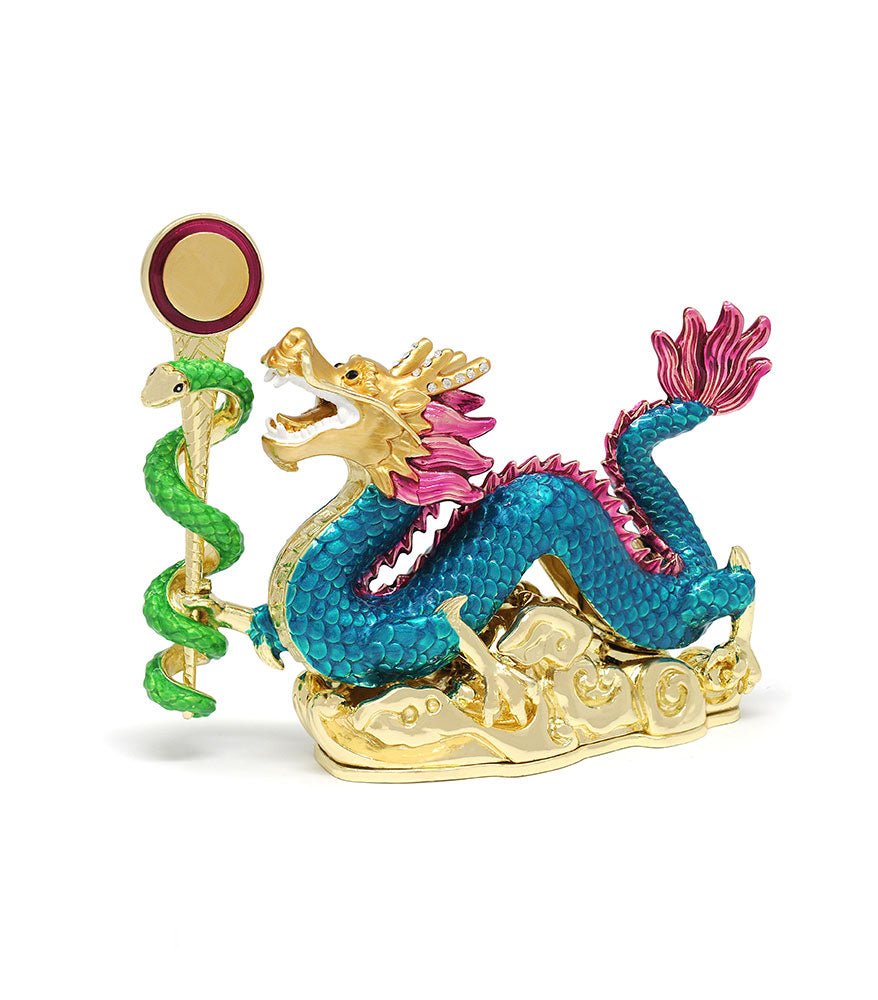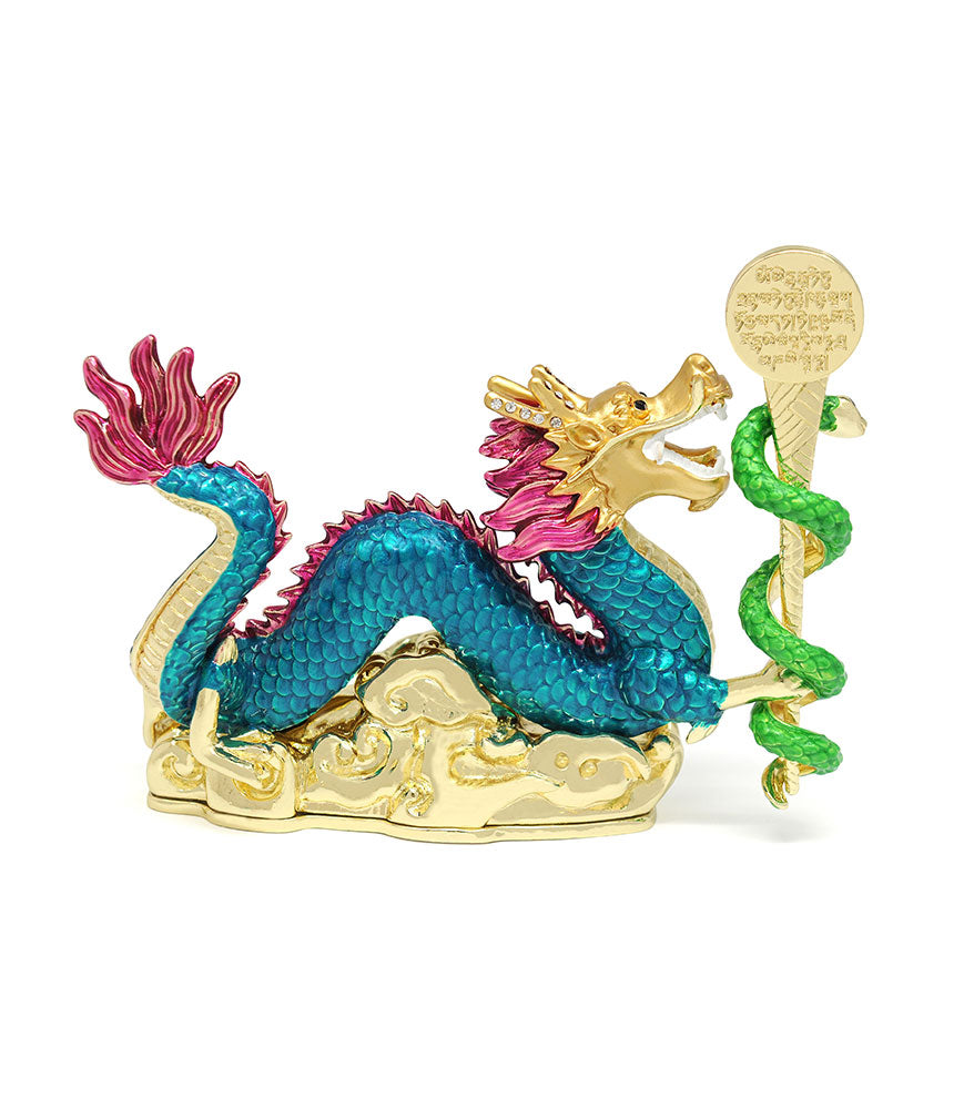 In Feng Shui, the union of Dragon and Snake creates the potent "House of Magic and Mysticism," harnessing powerful cosmic energies to manifest your deepest desires and to transcend limitations. This celestial pair, depicted with the Wish-Granting Mantra Mirror on a Magic Wand, is an excellent activator for Big Success!