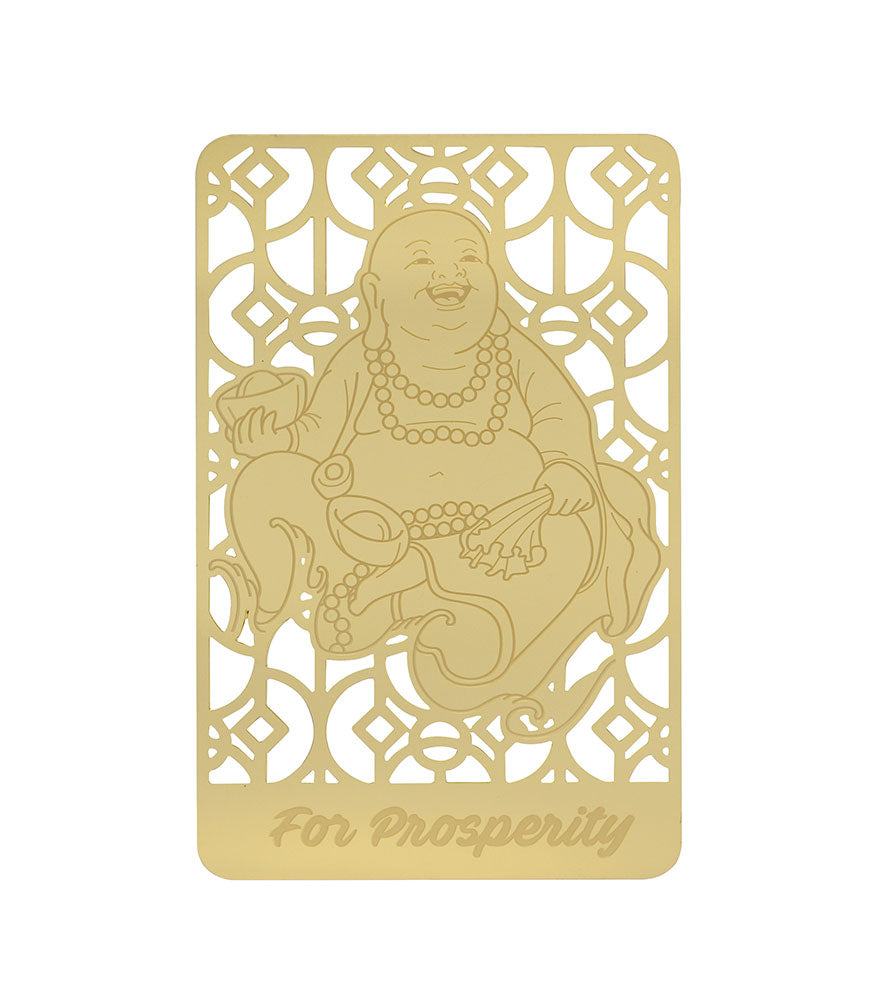 This joyful golden wallet card features the Laughing Buddha holding a golden ingot - a cherished symbol of happiness, wealth and contentment. Beloved as the bringer of smiles and prosperity, his presence attracts uplifting energy and eases life’s burdens.