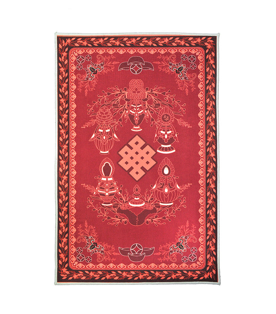 This exquisite carpet features six long-life vases associated with the longevity deities Amitayus, Namgyalma, and White Tara. At its center is a mystic knot symbolizing enduring happiness, surrounded by prosperity bats for lasting blessings and numerous coins and ingots for sustained wealth.