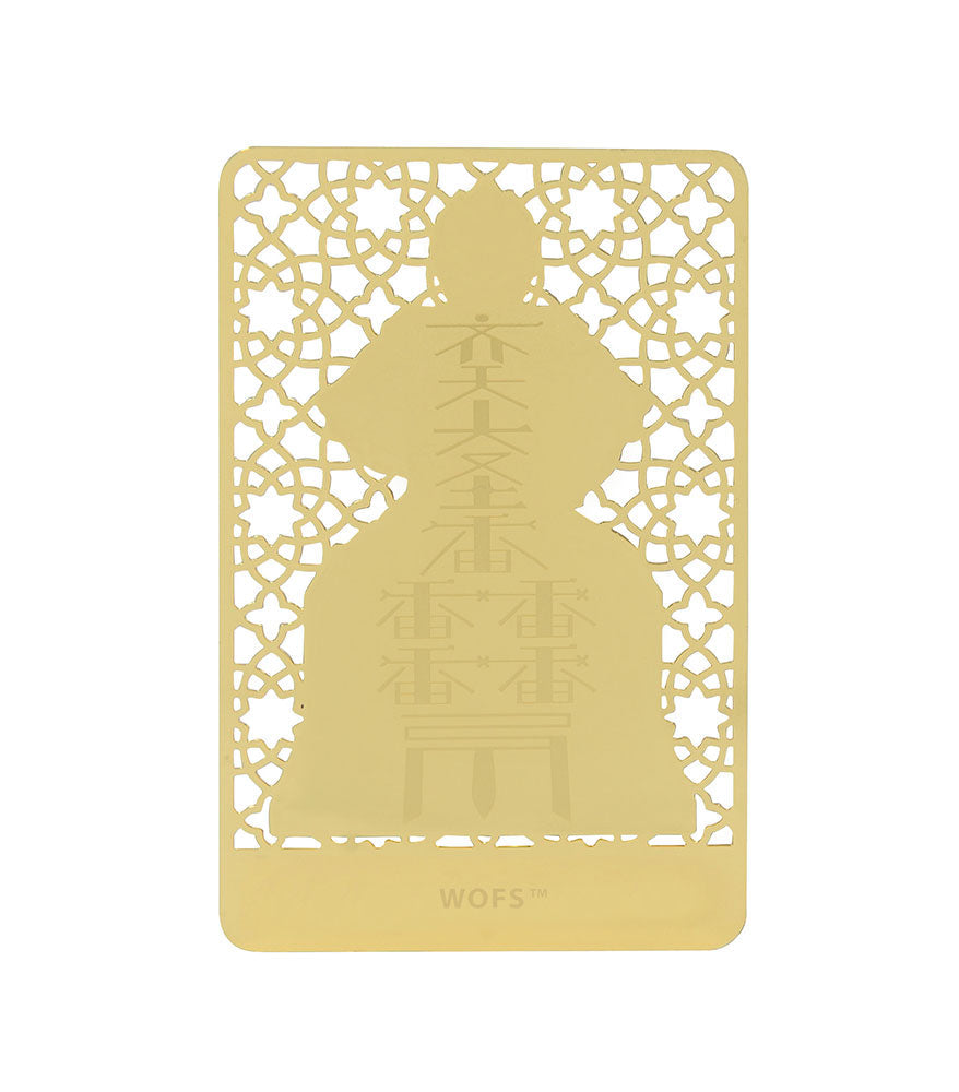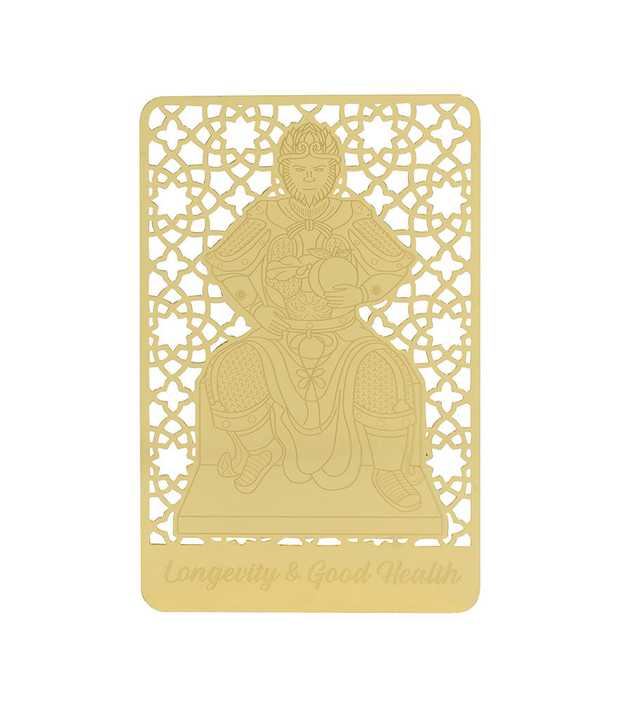 Featured on this gold wallet card, Sun Wukong is depicted seated on his throne, holding the Peach of Immortality, while the reverse side carries the Anti-Illness Talisman to summon good health and longevity.