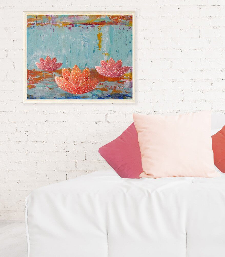 Lotus Pond portrays a sense serenity, stillness and the healing power of the natural world. While the stars on the lotus flowers depict a shimmering glow of energy the painting embodies magical light, harmony, contemplation & reflection.