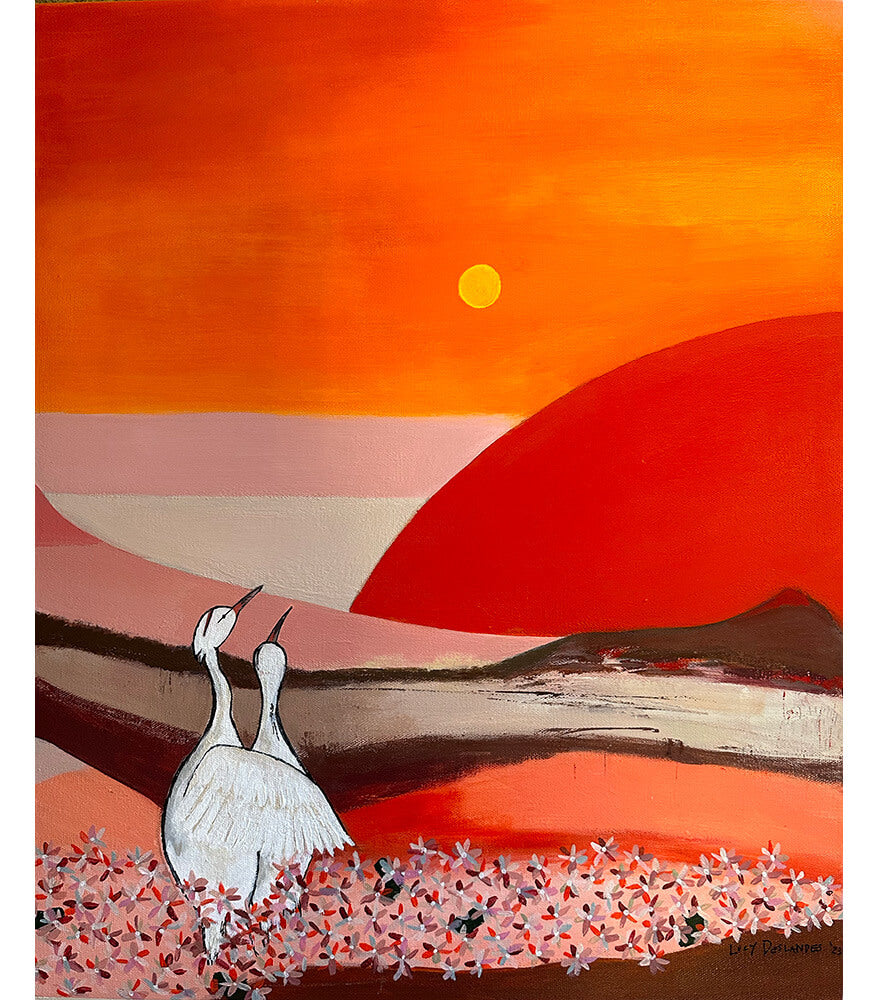 It features a pair of birds in a loving embrace watching the sunrise on a bed of blooms. There are undulating mountains offering support, and Fire energy in the reds and oranges to enhance the Earth energy of the Southwest.