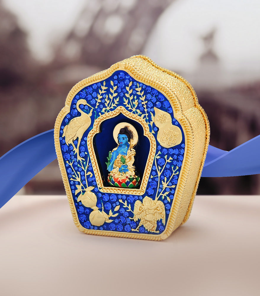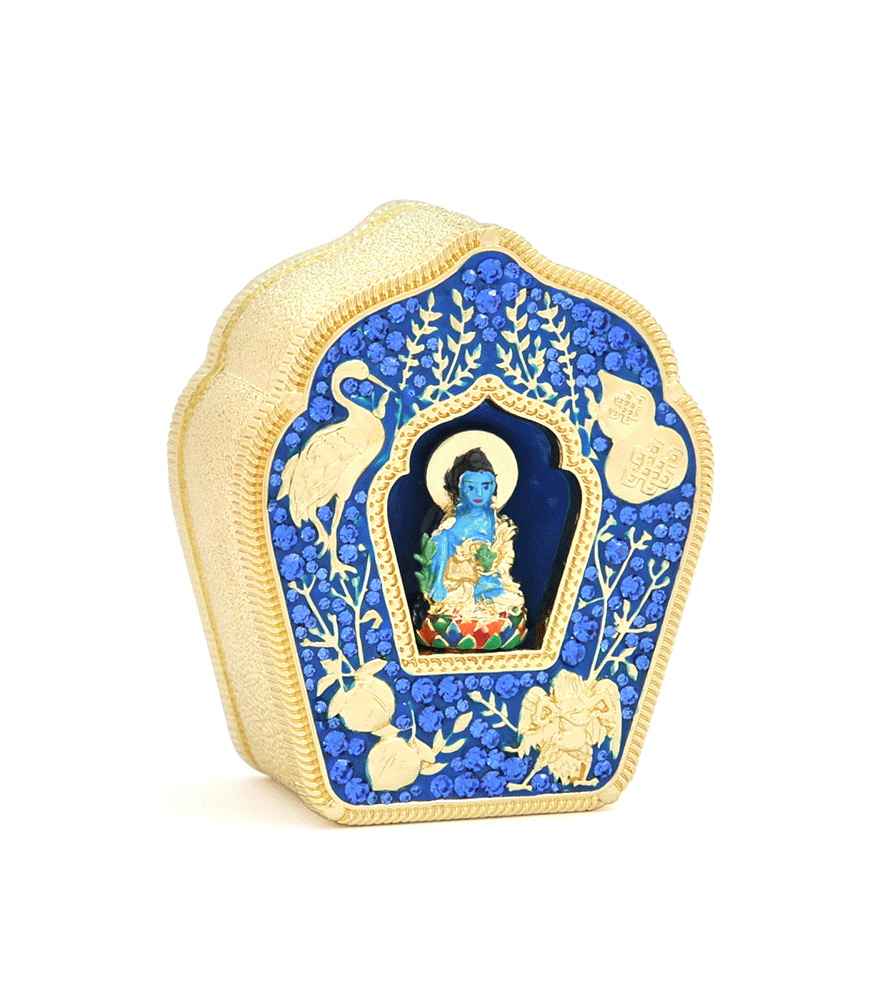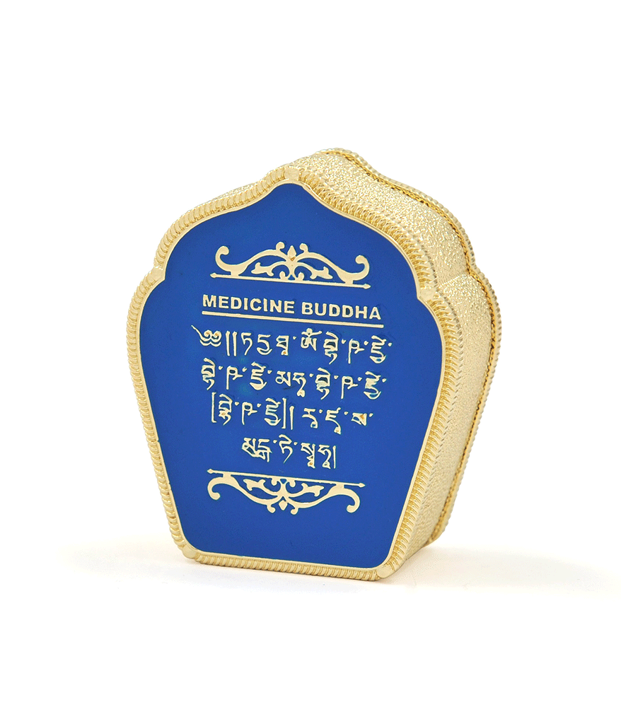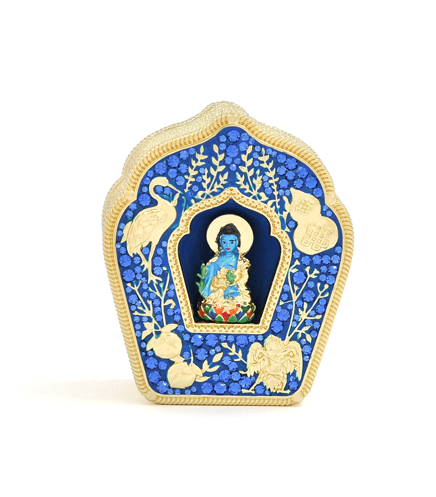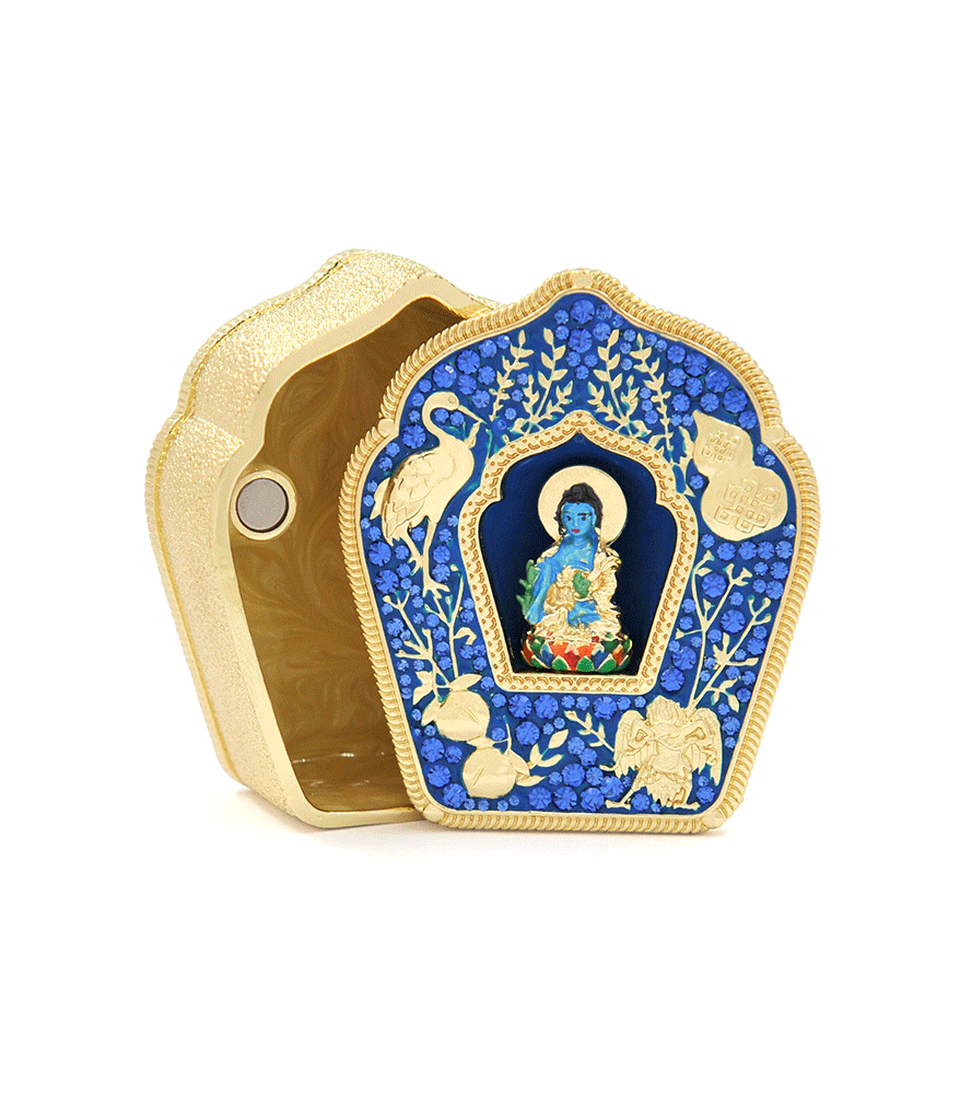This special Gau invokes the powerful protection of Medicine Buddha, the Deity that comes to the aid of anyone with health obstacles in their life. It features auspicious symbols that promote good health, such as the crane, the wulou, peaches and the Garuda Bird, and is empowered with Medicine Buddha’s mantra: TADYATHA OM BHEKHANDZYE BHEKHANDZYE MAHA BHEKHANDZYE (BHEKHANDZYE) RADZA SAMUGATE SOHA.