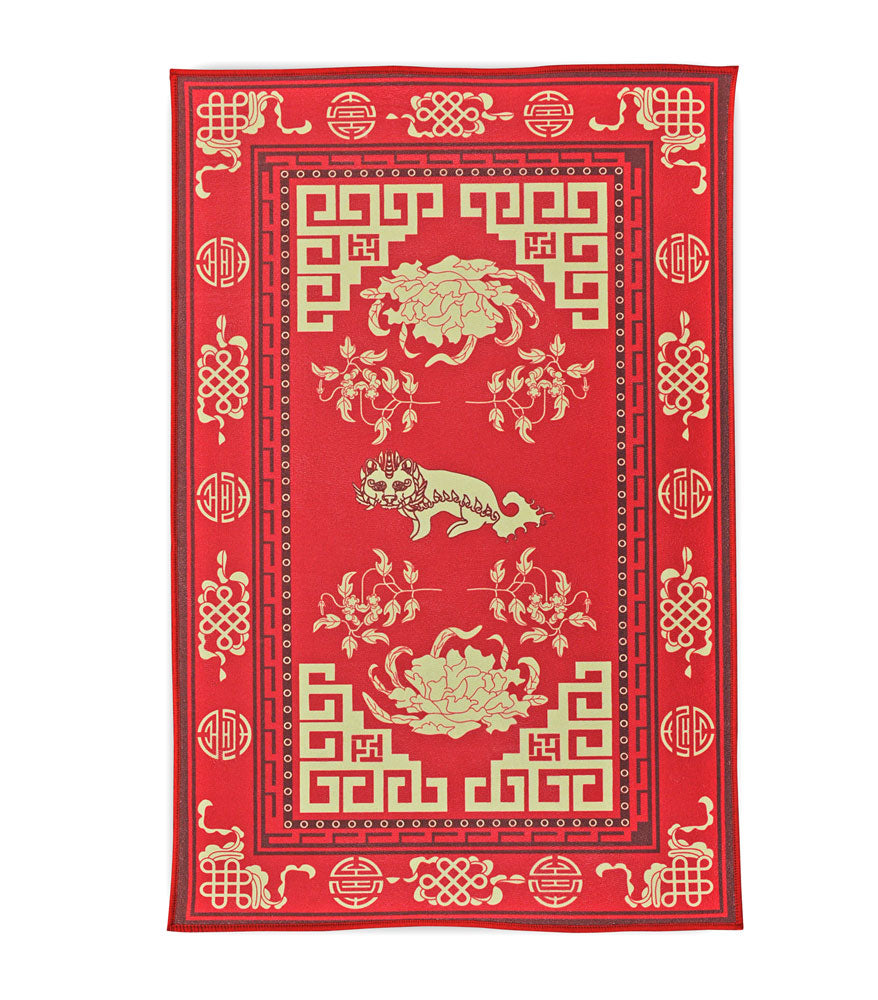 The Pi Xie is a celestial creature closely associated with the Tai Sui well known for its ability to attract wealth but also to protect the household. Additionally, this carpet features the longevity symbol and mystic knot for good health and everlasting happiness.