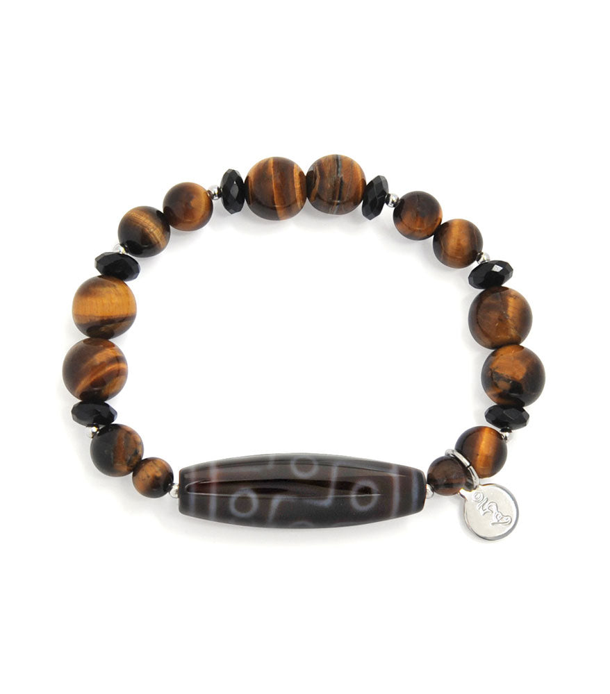 Care instructions: This dzi bracelet contains: tiger eye beads, Black Onyx beads and Dzi Beads. To clean, use a damp cloth but do not soak in water. Silver elements may tarnish when exposed to sweat for prolonged periods; polish with a jewellery cleaning cloth to maintain a quality shine.