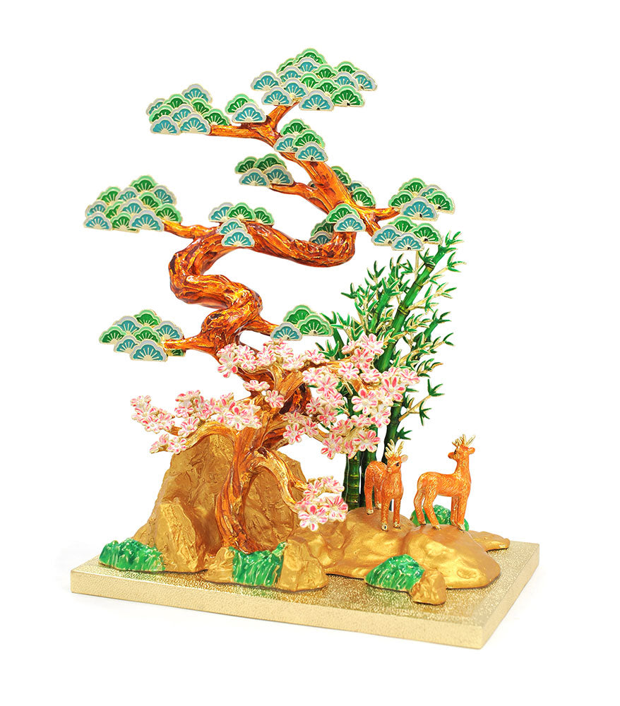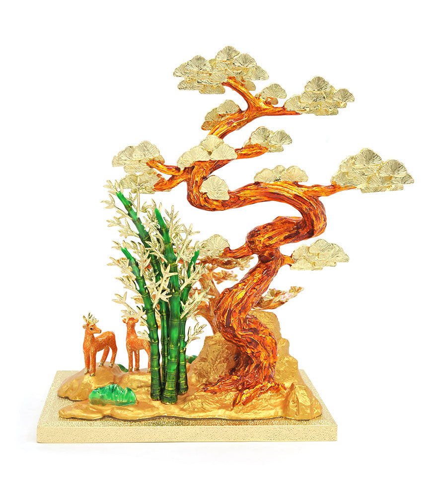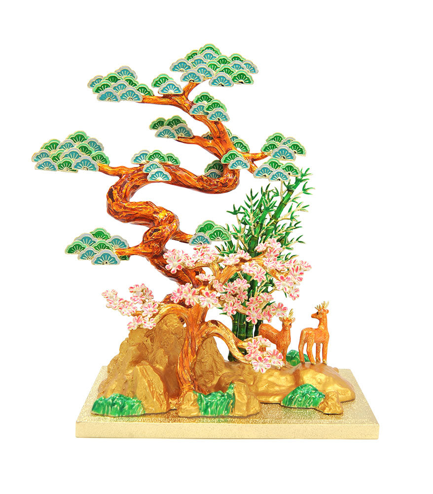 In Chinese culture, the pine, bamboo and plum blossom are known as the Three Friends of Winter for their resilient qualities and ability to thrive in harsh winter conditions. As an evergreen that can live for centuries, the pine is prized for its fortitude and longevity. The hardy bamboo, also an evergreen, is revered for its strength and tenacious growth in marginal lands. Its flexible stalks that yield to the wind are associated with being adaptable in difficult situations. The plum blossom, meanwhile, being the first flowers to bloom in spring, represents the beginnings of a good period and of successfully overcoming all hardships. When depicted together, they symbolise one flourishing in the face of adversity.