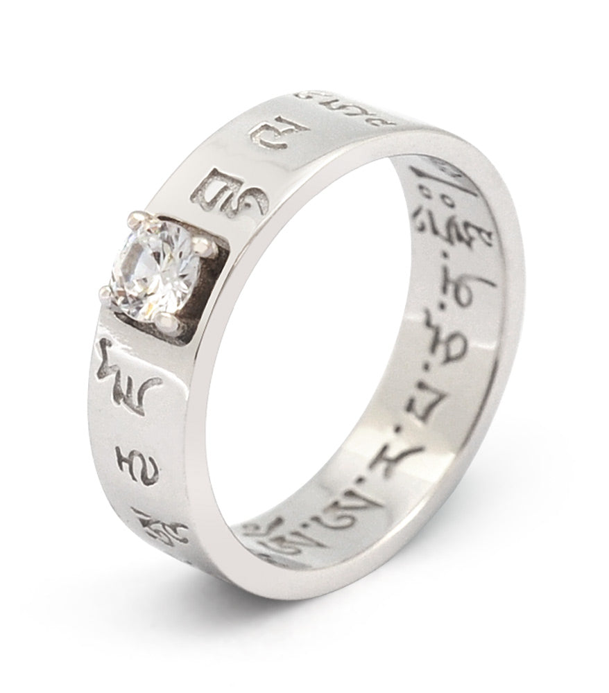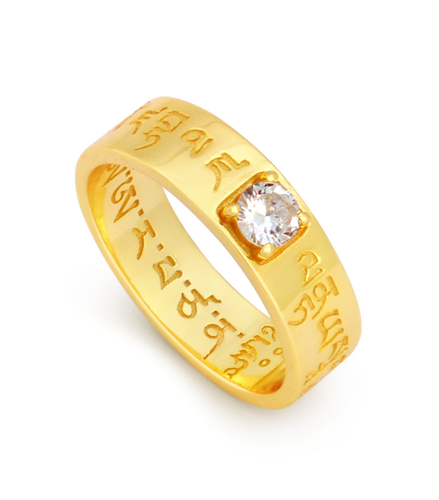 This beautiful mantra ring features White Dzambala's mantra on the outside, and Manjushri's mantra on the inside. White Dzambala is the Wealth Buddha who enhances career and work success. He increases your income stream and advances your job prospects, boosting opportunities for promotion allowing a smooth rise to the top of your profession. Manjushri is the Buddha of Wisdom, bestowing good judgement and instincts to help you make all the right choices and decisions.