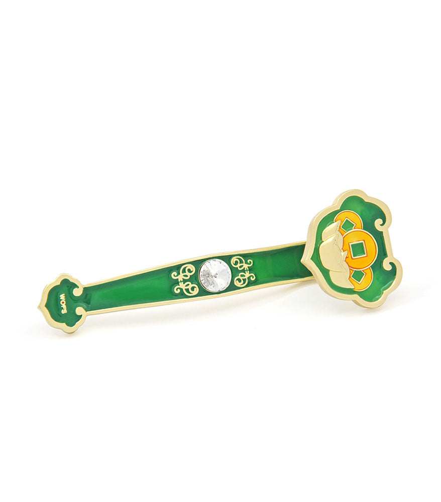 This green-colored Ru Yi features I-Ching coins and golden ingots, popular symbols of wealth in Chinese culture. The color green is always the color of growth, it signifies intelligence and creativity. This Ru Yi is a wonderful energizer of wealth luck. Anyone wishing to make more money and to increase their streams and sources of income would benefit from this Ru Yi. Represents continually growing wealth.